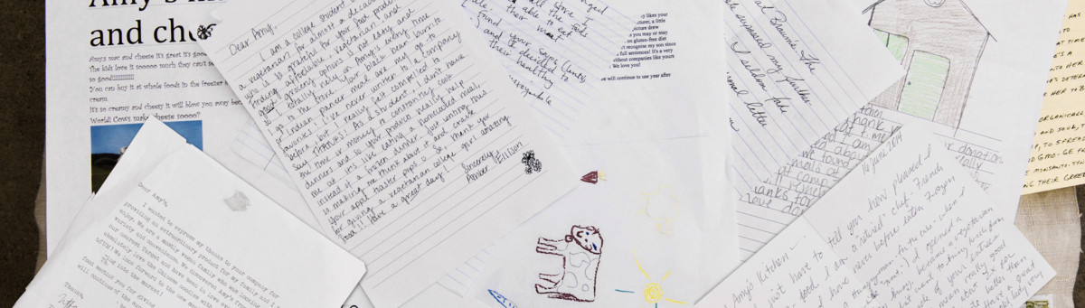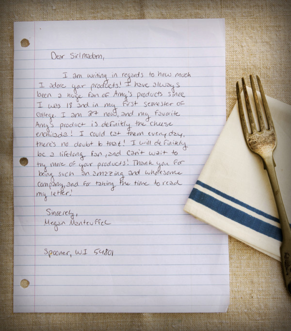 I am writing in regards to how much I adore your products! I have always been a huge fan of Amy’s products since I was 18 and in my first semester of college. I am 27 now, and my favorite Amy’s product is definitely the cheese enchilada! I could eat them everyday, there’s not doubt to that! I will definitely be a life-long fan, and can’t wait to try more of your products! Thank you for being such an amazing and wholesome company and for taking the time to read my letter!