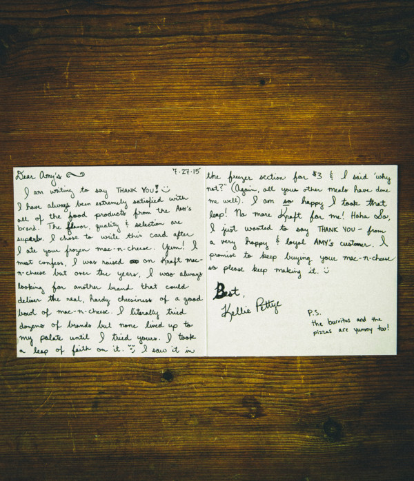 I have always been extremely satisfied with all of the food products from the Amy’s brand. The flavor quality and selection are superb. I chose to write this card after I ate your frozen mac-n-cheese. Yum! I must confess, I was raised on Kraft mac-n-cheese but over the years, I was always looking for another brand that could deliver the real, hardy cheesiness of a good bowl of mac-n-cheese. I literally tried dozens of brands but none lived up to my palate until I tried yours. I took a leap of faith on it. I saw it in the freezer section for $3 and I said “why not?” (again all you other meals have done me well). I am so happy I took that leap! No more Kraft for me! Haha So I just wanted to say THANK YOU – from a very happy and loyal Amy’s customer. I promise to keep buying your mac-n-cheese so please keep making it.