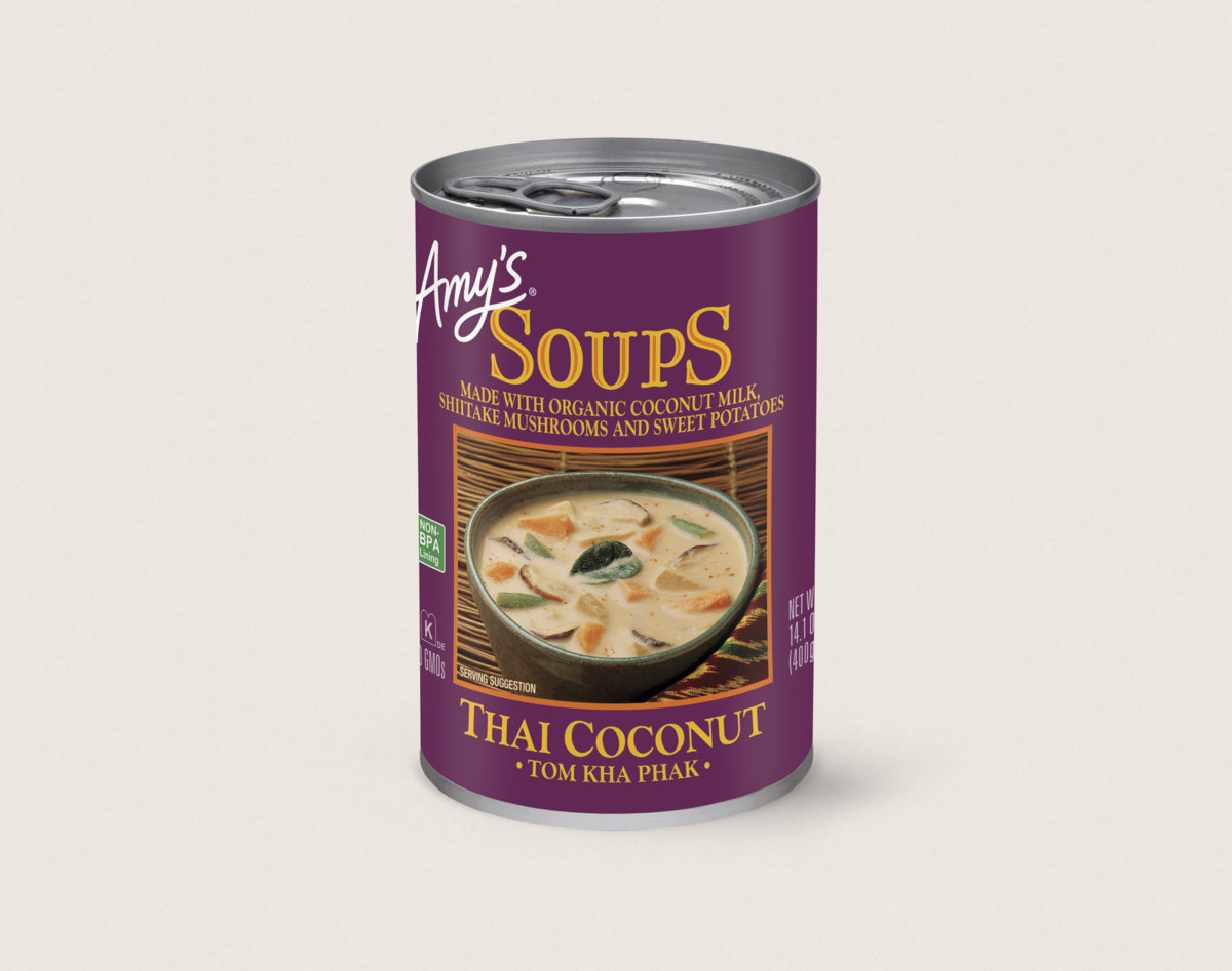 The traditional “Tom Kha Phak” is a satisfying Thai favorite. Amy’s version combines sweet coconut milk with mild spices, lime leaf, lemongrass, house-made organic tofu, shiitake mushrooms, sweet potatoes, green beans and other organic vegetables. Try it over rice, too.